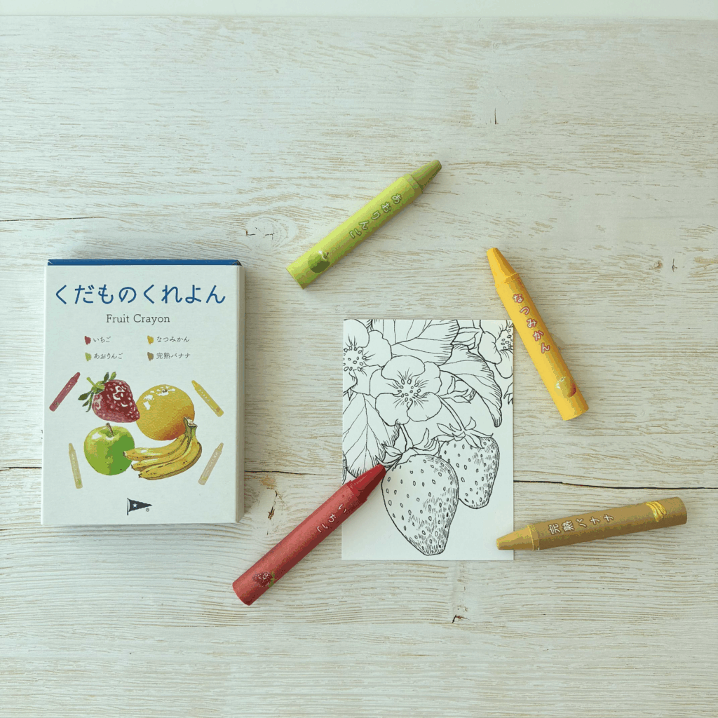 今回の「くだものくれよん」も、廃棄されるフルーツを乾燥パウダーにしてクレヨンに混ぜることで、資源を有効活用。赤はイチゴ、黄は夏みかん、緑は青りんご、茶は完熟バナナと、それぞれのフルーツの色を活かした4色が揃っています。さらに、顔料には食品の着色に使用される成分を採用し、安全性にも配慮しています。