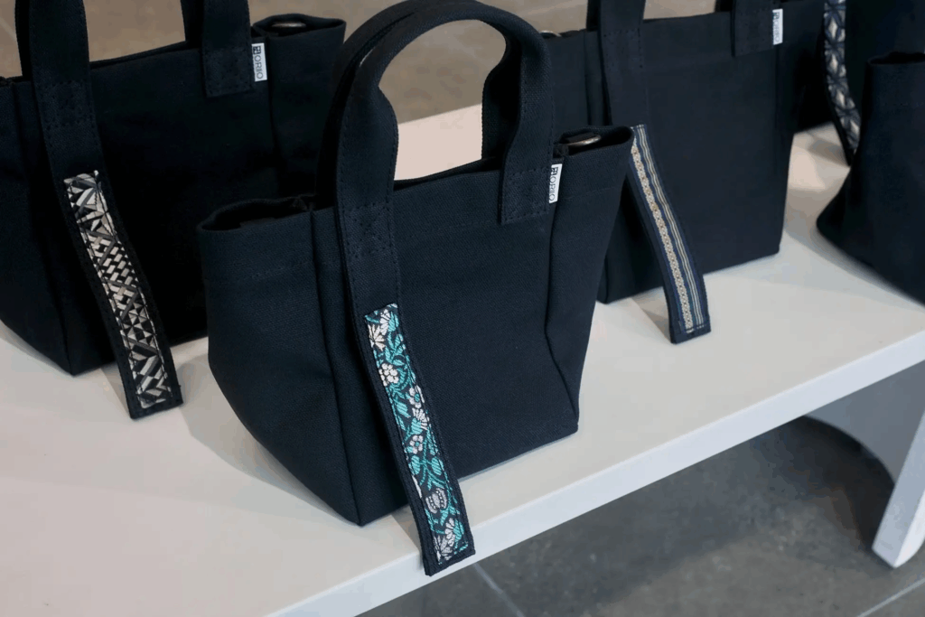 博多織は伝統的な帯として使われてきましたが、現代ではその需要が減少しています。「NABIKI」は、博多織を日常生活に取り入れ、次世代に繋げるために作られました。帆布と組み合わせることで、丈夫で使いやすいバッグに仕上がっています。