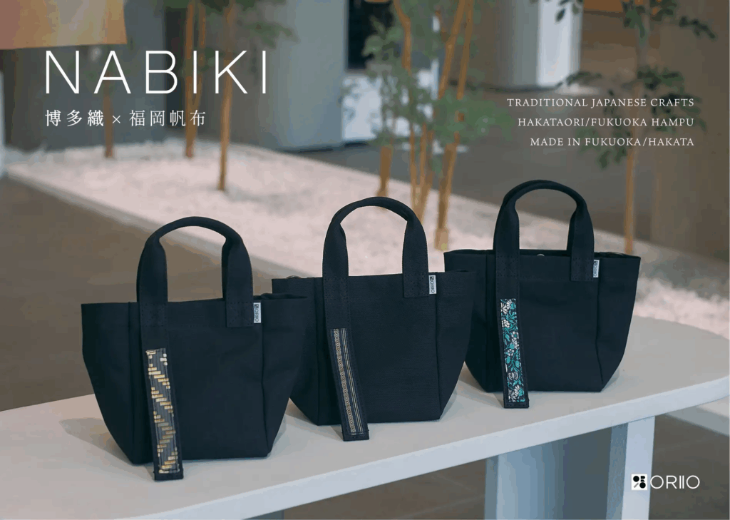 それが、福岡帆布と博多織の帯地ハギレを組み合わせたバッグ「NABIKI」です。