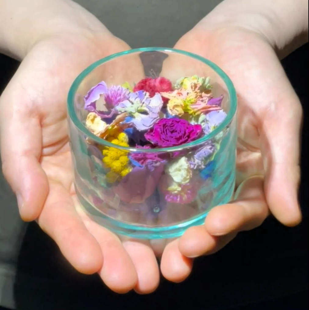 - 割れたガラス水槽と廃棄予定の花「ロスフラワー®」を再利用し、美しいインテリアアイテムに。