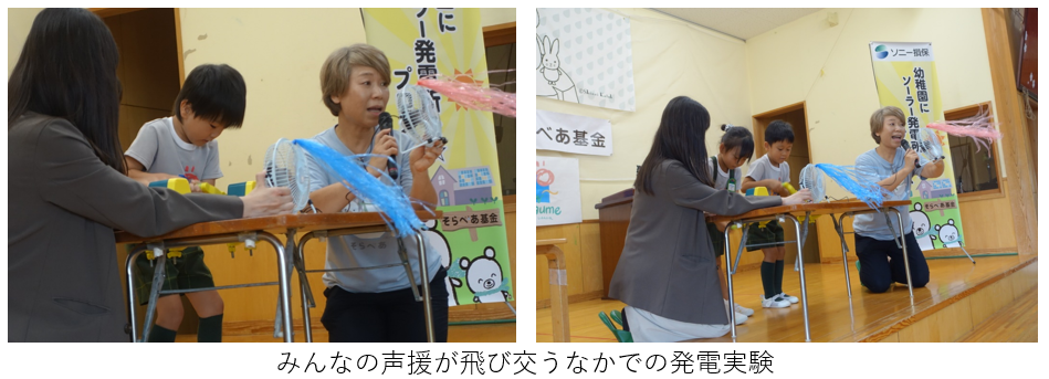 - 寄贈記念式典では、子どもたちが紙芝居やクイズ、発電体験を通じて、地球温暖化やエネルギー問題について学んだ。