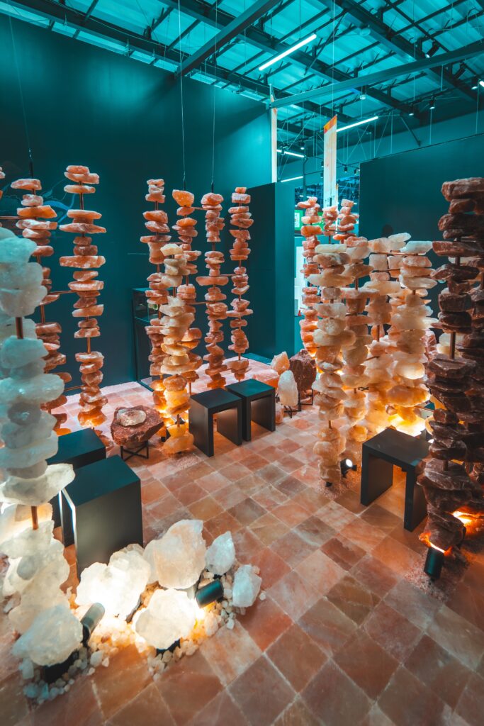 展示空間に並ぶ岩塩のオブジェは、見る角度や光のあたり方によって表情を変えます。さらに、産地ソルトレンジの歴史を描いた壁画や、淡いピンクから濃いピンクへとグラデーションを織りなす塩の結晶が、来場者を“塩の宇宙”へと誘います。