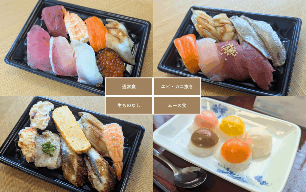 「通常」「エビ・カニ抜き」「生ものなし」「ムース食」の4種類を用意しました。